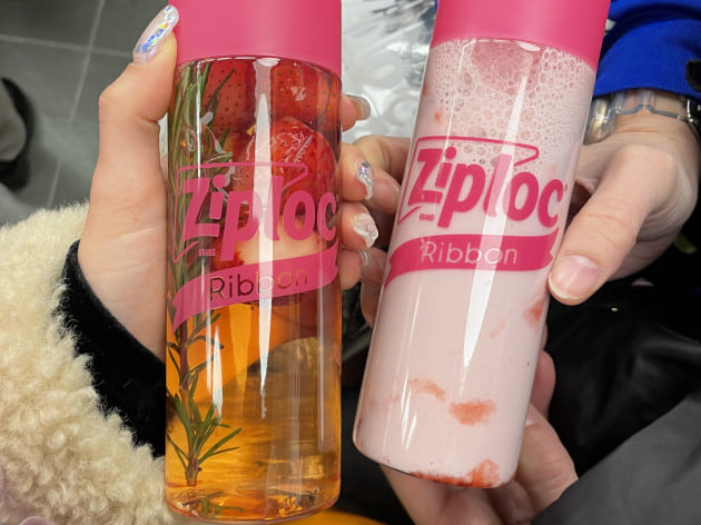 右はZiplocに合わせてピンク色のシロップを入れたいちごミルク♪