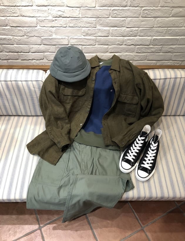 こちらは八巻の合わせ〜20代の大学生ならではなルーズシルエット&ミリタリーの雰囲気を取り入れたナイスなMIXスタイルですね。抜かりなく色を拾ってるのもポイント高し!