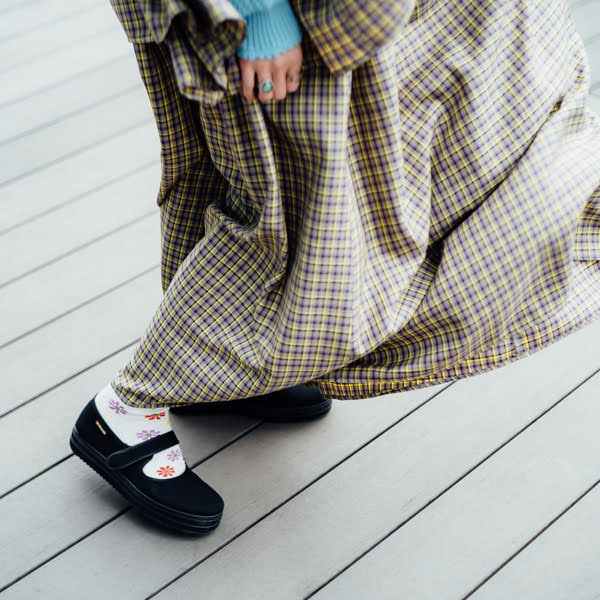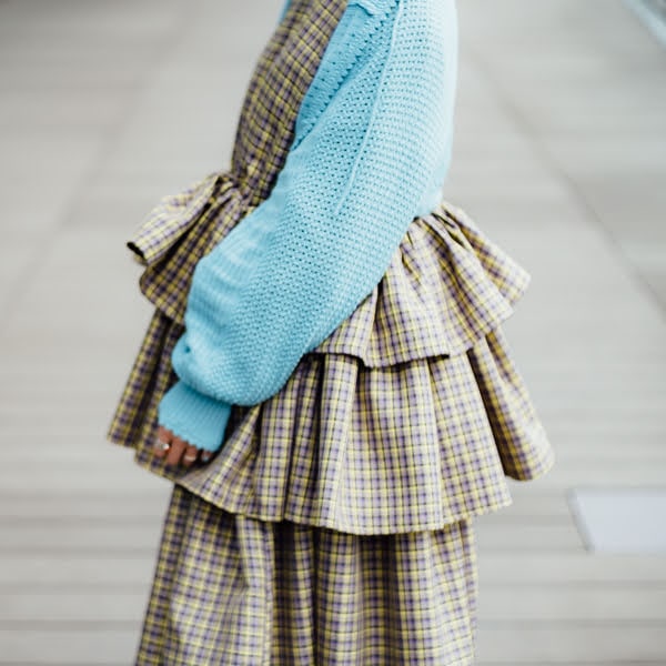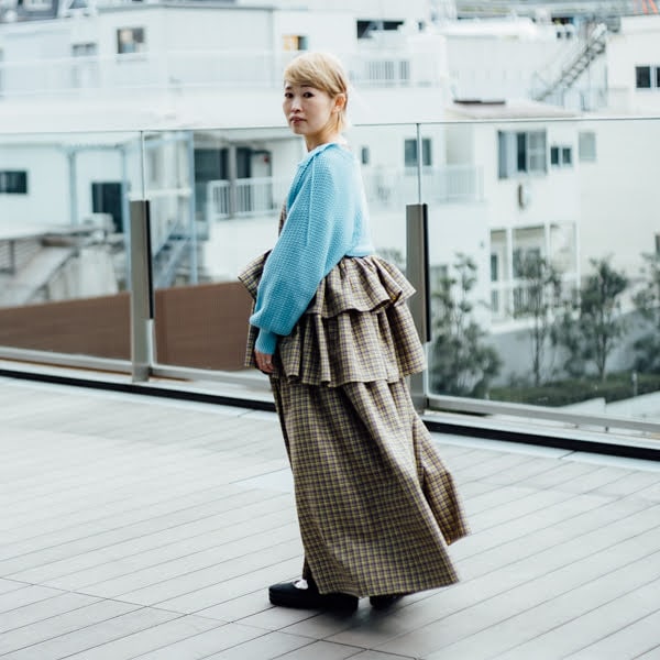 鮮やかなブルーのニットボレロとレイヤードし、チェック柄が引き立つスタイリングに仕上っています。