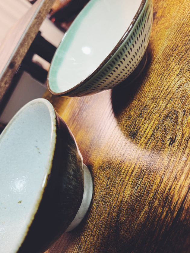 部屋の余計な物が写り込まないように撮ったらものすごく斜めになって不安定な写真ですが、夫婦で使っている茶碗です。