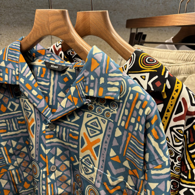 BEAMSオリジナルのジオメトリック柄が全面にプリントされたオープンカラーシャツ。