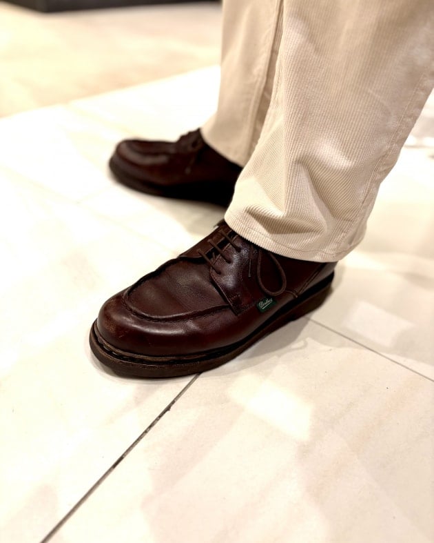 ダークブラウン(カフェ)の「シャンボード」はメンズスタッフ高橋。シャンボードはビームス取り扱いが通常でもございます。が、ビームスではブラック/マロン(赤茶)/ネイビーの3色の取り扱い。高橋が履いているダークブラウン(通称カフェ)はこれまた昨年のトランクショーゲット品。(手入れして雰囲気良くなってますね。)このカラーは普段使いしやすいので、今回のトランクショーでもまた入荷するはず。。定番モデルなだけに、まだパラブーツをお持ちではない方にはシャンボードはオススメです。