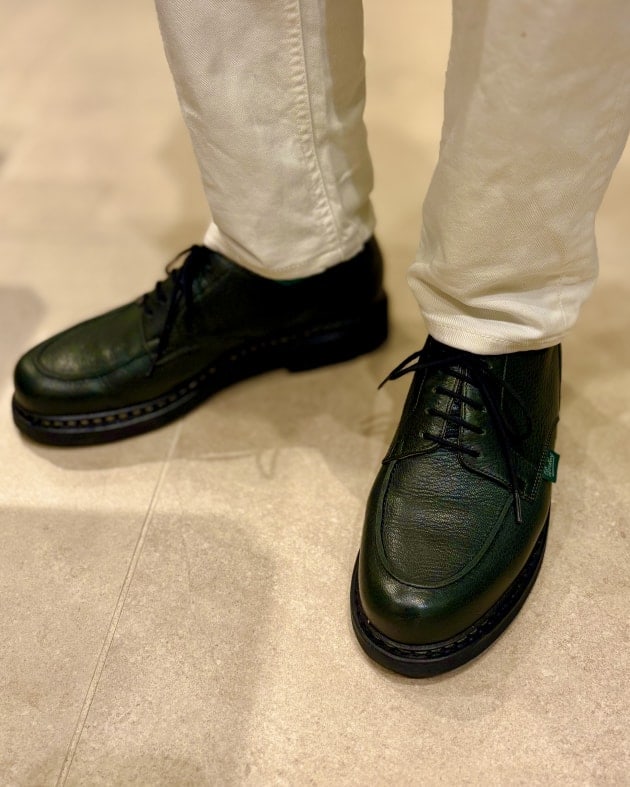 こちらはお客様のディアスキン(鹿革)のシャンボード。(私も昨年購入しました。)この革、柔らかくて最初から履きやすかったです。パラブーツとしても昨年から登場したモデルです。ファッションを思い切り楽しみたい方におすすめです。