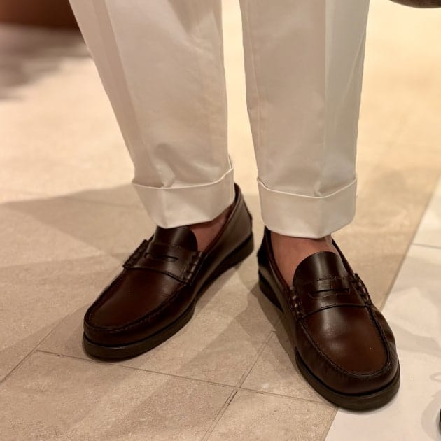 ご主人のローファータイプ「コロー」はジャケットにも相性良し。革靴としての面構えを維持しながらも、スニーカー感覚で履けてしまうカジュアルさが魅力。パラブーツ独自のマリンソールなるグリップ力抜群ソールです。クッションも良く、入門編としても取り入れやすい。