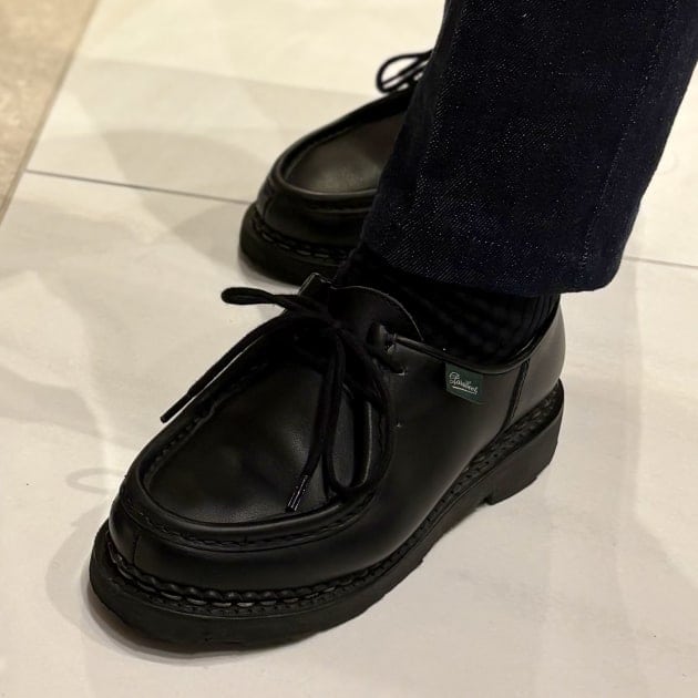 レディーススタッフ山口のパラブーツ「オルセー」。メンズにも同じ顔つきで「ランス」があります。こちらも昨年のトランクショーでゲットした1足。山口が履いている姿を1年ぶりに見た気が。。笑。まあ、重さもあるし、馴染むのに時間もかかるし、理解できなくもありません。重厚感があって、革靴と同じように足に馴染ませていく過程が必要ですから「すぐには履きやすくはならない」のも事実。今回のトランクショーまでに、馴染ませておいて欲しいな〜。履いたときの感じ方やこなし方は、メンズ目線とはまた違う気がするので、所持しているスタッフの経験談こそ、お客様に一番響くと思うんですよね。期待しております!(スタッフ志柿もね。笑)