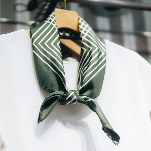 深みのあるグリーンが印象的なスカーフ。コーディネートの邪魔をしないコンパクトな仕上がりです。