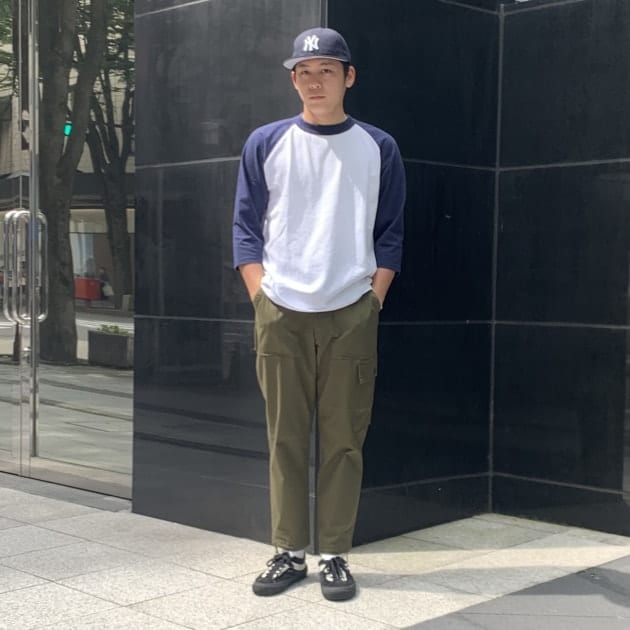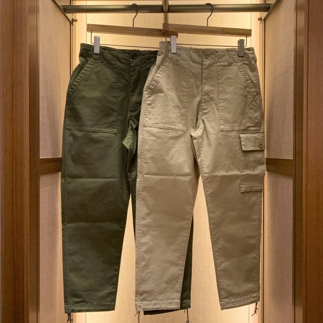 緩やかなテーパードシルエットや、片側だけに付けたサイドポケットによりミリタリー感はありつつも、無骨過ぎない印象に仕上がっています。