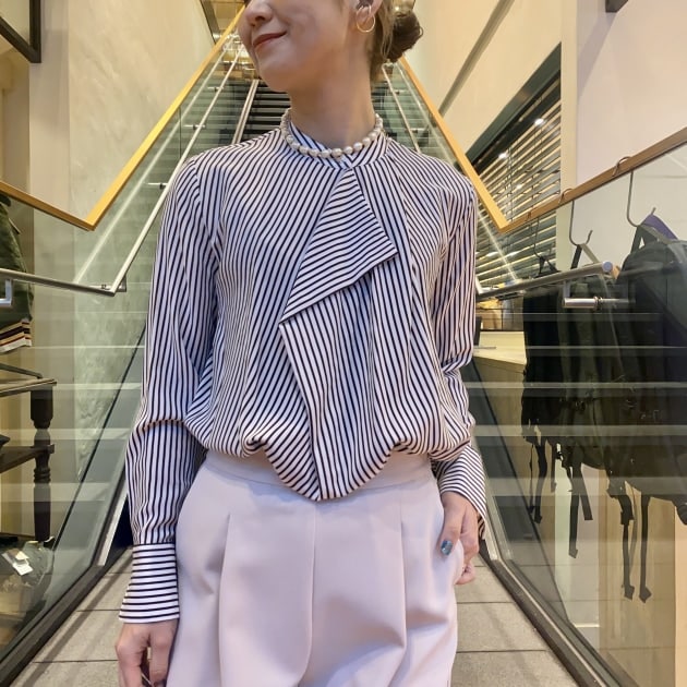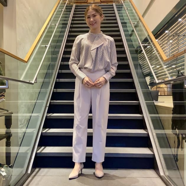 合わせたブラウスは、フロントにラッフルデザインがあるのでジャケット着用でも華やかさ倍増します。