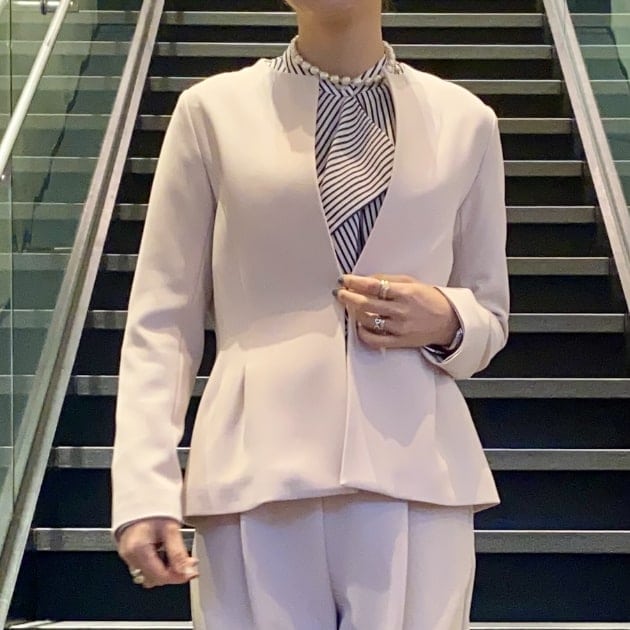 本日はそんなシーンに、相応しい華やかでフレッシュさも感じられるベージュカラーのセットアップをご紹介いたします。