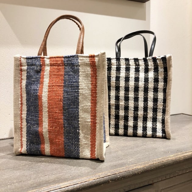 ギンガムチェックとストライプの2色で、持ち手がレザーになっています!