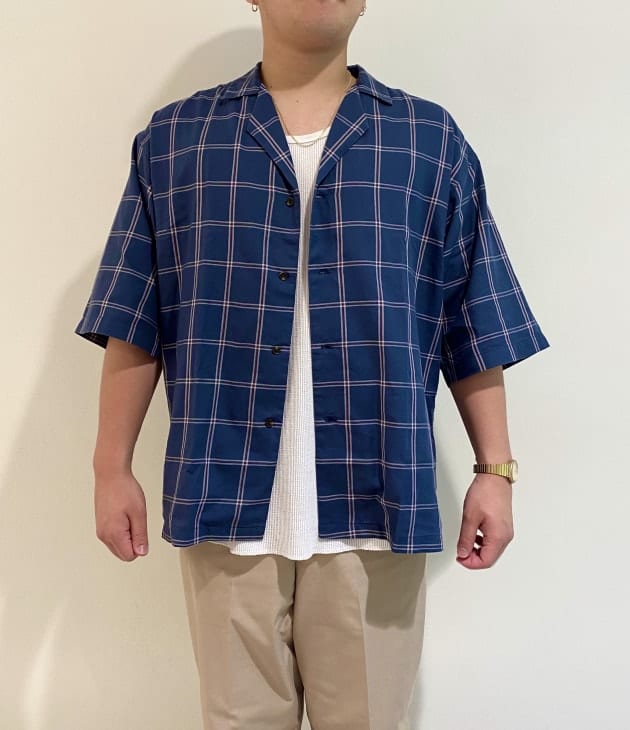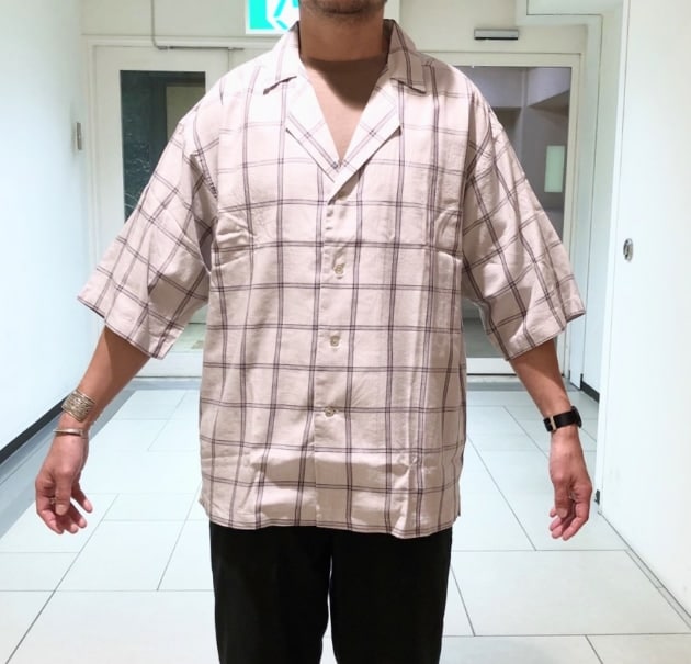 二つ目はこちらのシャツです!ジャケットのようなラペル風のオープンカラーになっていて、ジャケットのような綺麗めなコーディネートが楽しめます!