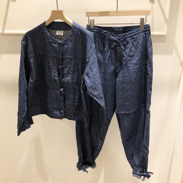 チャイナボタンも可愛らしいデニムジャケットとパンツのセットアップ♩