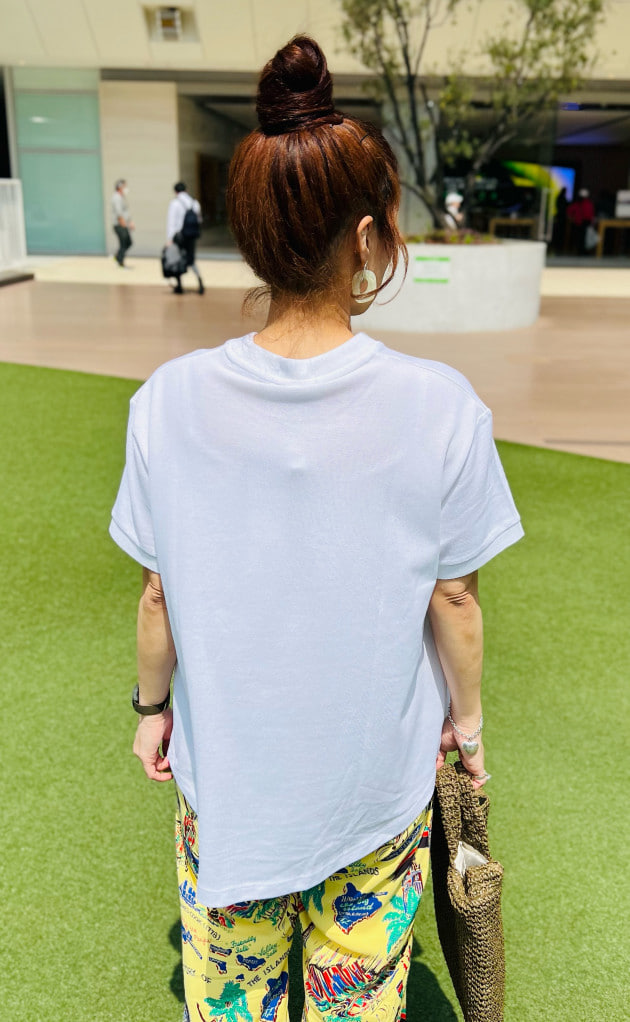 着丈は前が短くて後ろが長いのでワイドパンツやスカートにも合わせやすいです◎
