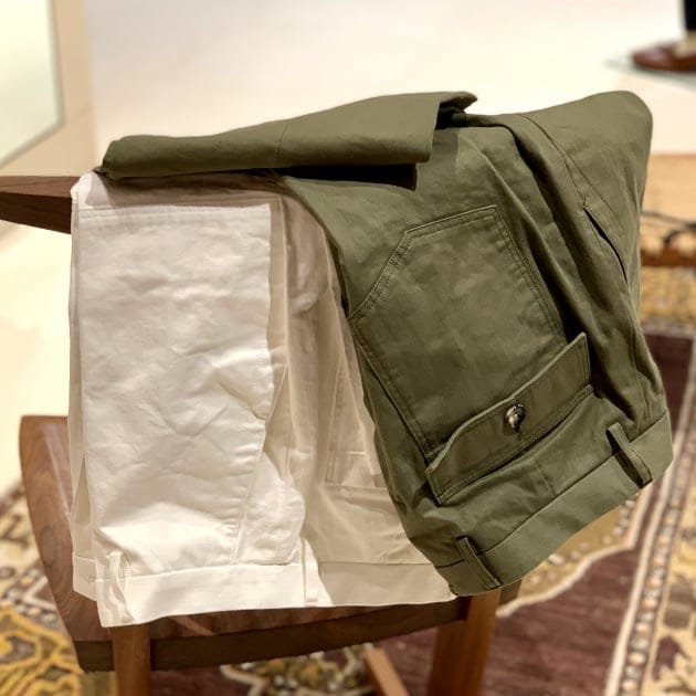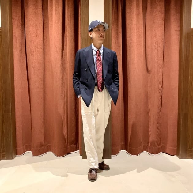 上品なジャケットとの表情の差を出しつつ、カジュアルな雰囲気をミックスさせたかったので、パンツはベイカーパンツを◎