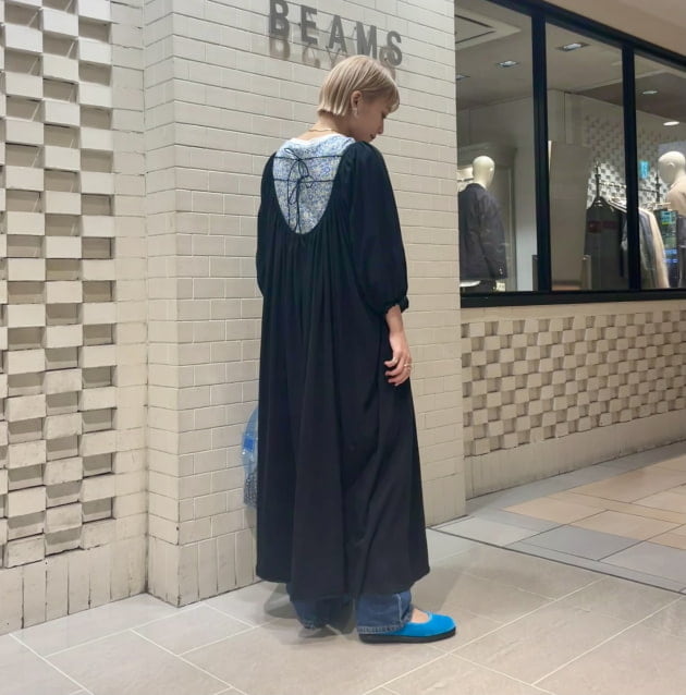 スタッフ黒田(H:153cm)のスタイリングは、彩り豊かな柄のワンピースが引き立つよう、シンプルにまとめたスタイリングです。