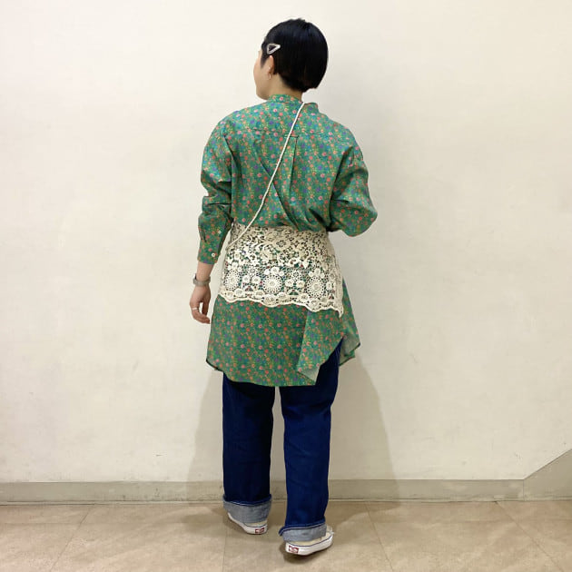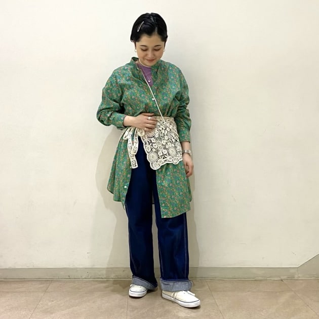 あるいは、丈がやや長めなのを利用して、インナー遣いであそんだり、スウェットやベスト等とレイヤードしても良さそうです☺︎