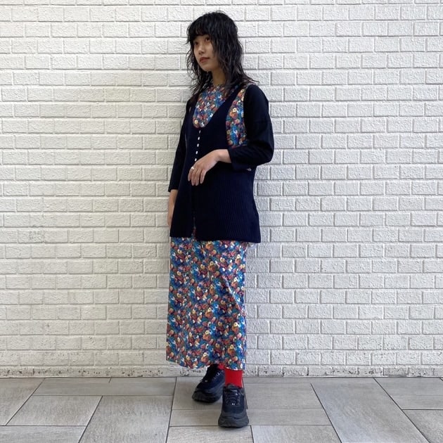 スタッフ黒田(H:153cm)のスタイリングは、彩り豊かな柄のワンピースが引き立つよう、シンプルにまとめたスタイリングです。