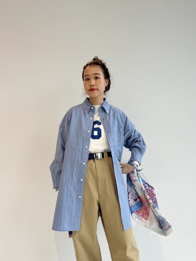 ホワイトはこのようにコーディネートしました。ばさっとビッグシルエットのシャツを羽織ってメンズライクに。