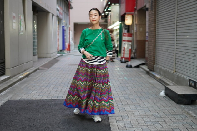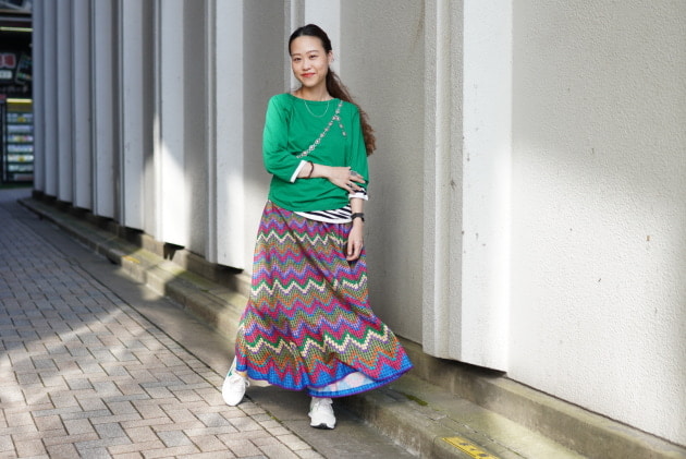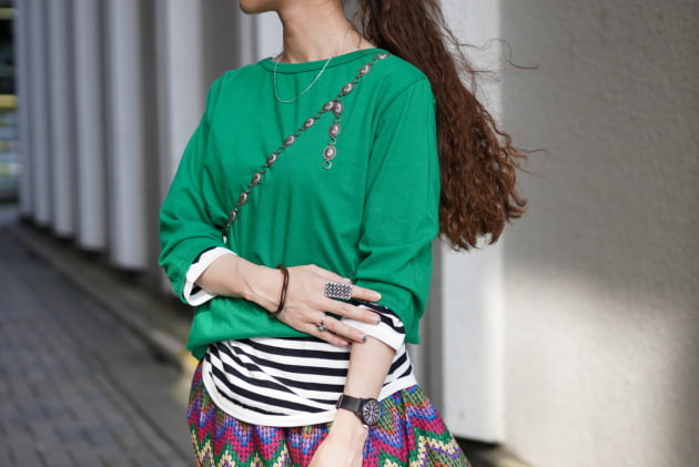 重ねて着たグリーンのTシャツは一つサイズをあげての2を着用し、重ね着した時にゴワつかない様