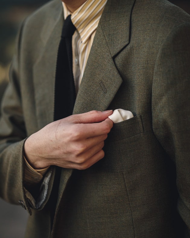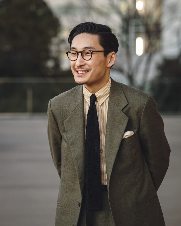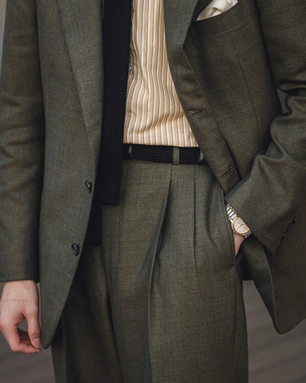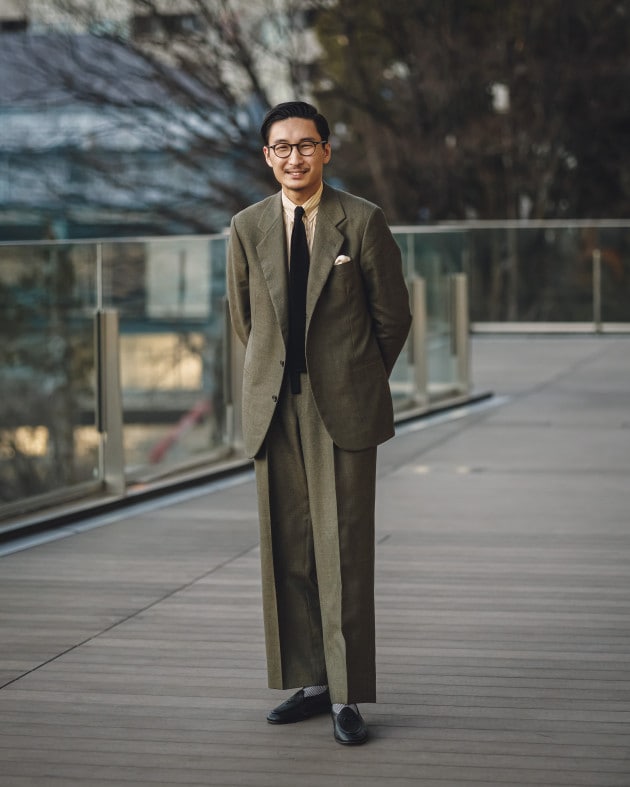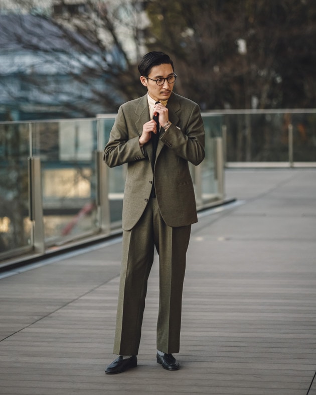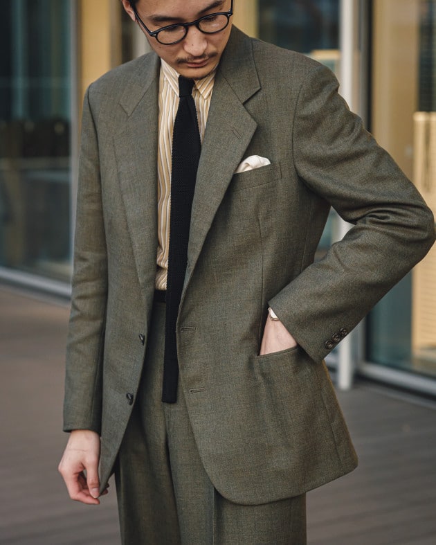 レトロなエレガンスがありつつ、モダンさも感じるスーツスタイル。色遣いと品の良いアイテム選びで古臭く感じないコーディネートに仕上がっています。昔のいいものを直して自分らしく着こなす。スーツを愉しんだ、阿由葉らしい着こなしですね。