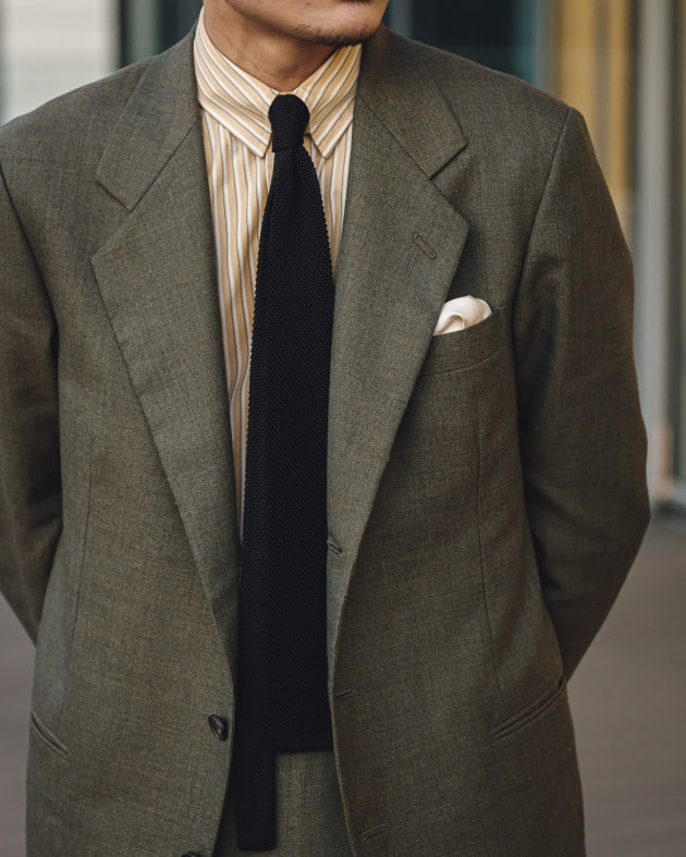 Vゾーンはベージュのストライプシャツにブラックのニットタイ。小ぶりなタブカラーとサンドストライプがほんのりレトロな表情に。