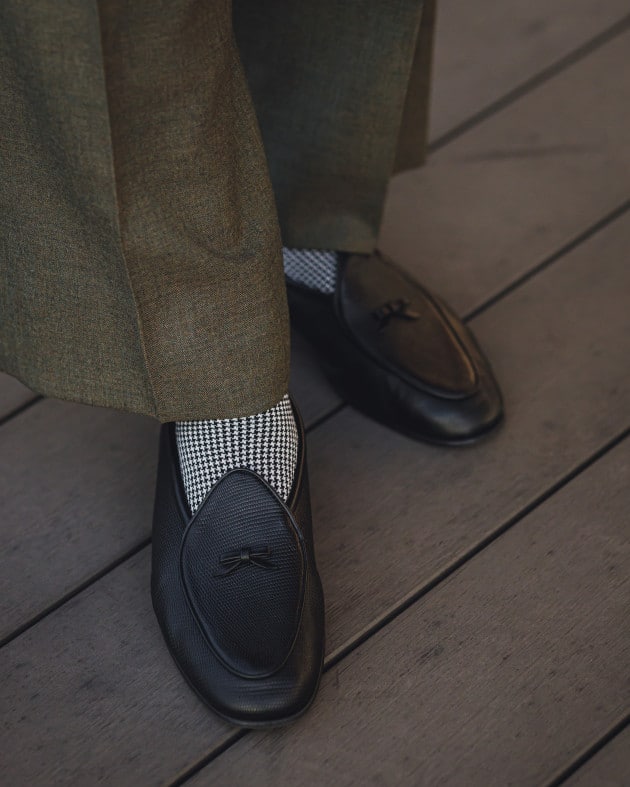 表革のベルジャンシューズで軽快ながら上品に足もとを締めます。ハウンドトゥースのソックスもさりげなく効いていますね。