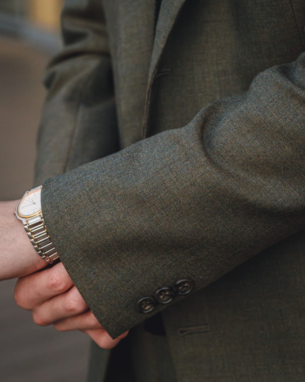 そしてこちら、シルエットをかなり調整しています。肩パッドを抜き、肩幅を詰め、胴回り全体を詰め、ボタンの返り位置を変え、、、というこだわりようです。購入金額の何倍ものお直し代がかかったそう。。