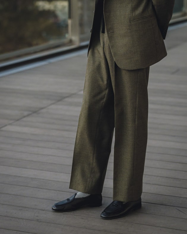 深めの股上に深めのツープリーツ。ベルトは22春夏でも展開予定の<L'AIGLON>のメッシュベルトです。ブラックですがどこか柔らかな印象を引き出せるのがこのベルトのポイント。