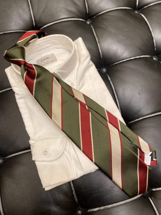 コットンの自然な風合いとネクタイの掠れた表情が絶妙にマッチしています。