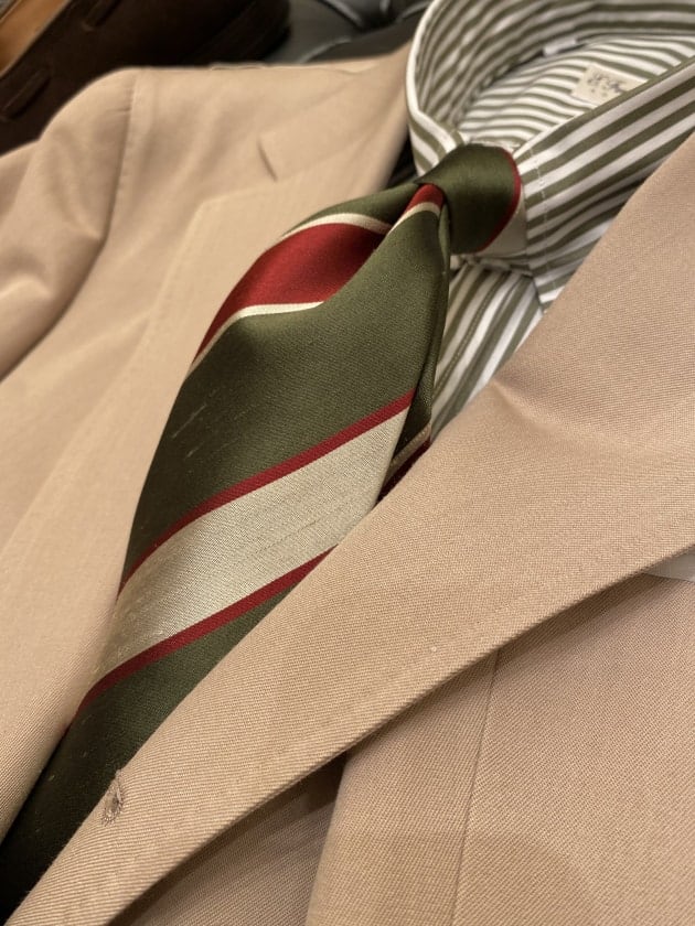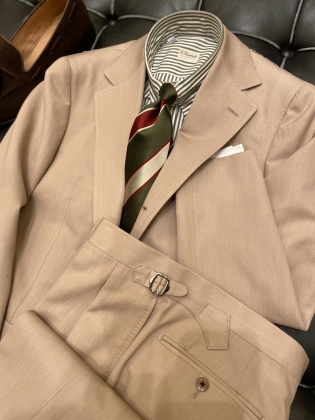タイの色合いや生地感を考慮し、淡色のベージュでコットン混じりの素材感のあるスーツを合わせるとすんなり馴染みました!