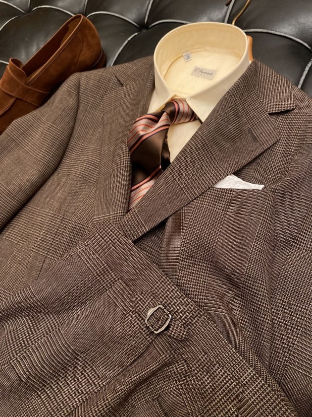 ストイックなグレンチェックですが、ブラウン、キャメル、ベージュ系のやや明るい絶妙な色合いの為、どこかリラックスした表情。ラグジュアリーな雰囲気も纏っており、何とも形容しがたい魅力的な生地。