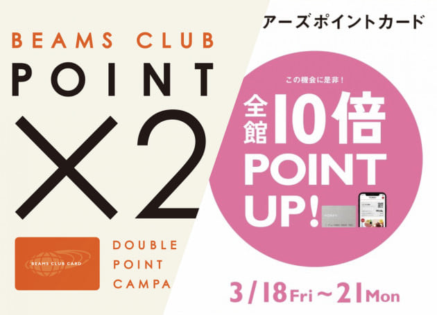 3月18日からビームスクラブダブルポイントキャンペーンがスタートしております。また、18日〜21日までの間はモアーズポイントも10倍となります。非常にお得な期間となりますので、この機会をぜひご利用ください。(ビームスクラブダブルポイントキャンペーンは27日までです。)