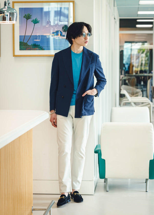 コーディネートは今シーズンらしく、ブルーのグラデーションで構成するのがおすすめ。オフホワイトのパンツに合わせて、爽やかな印象に。