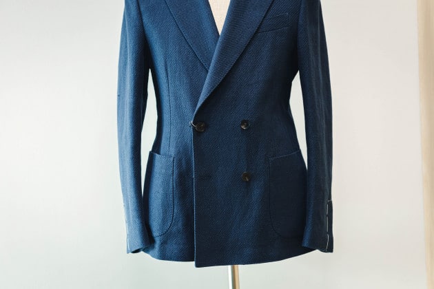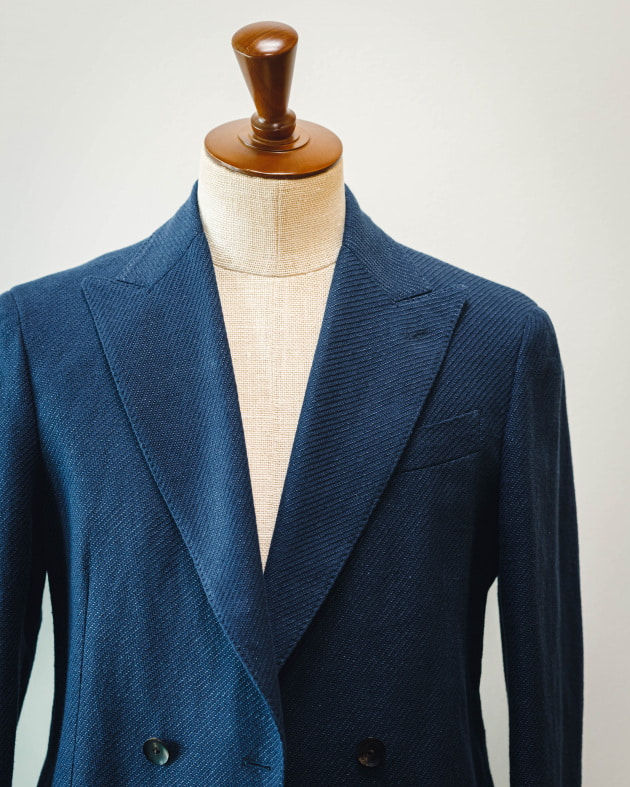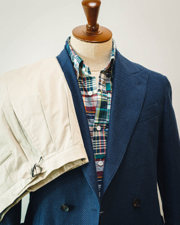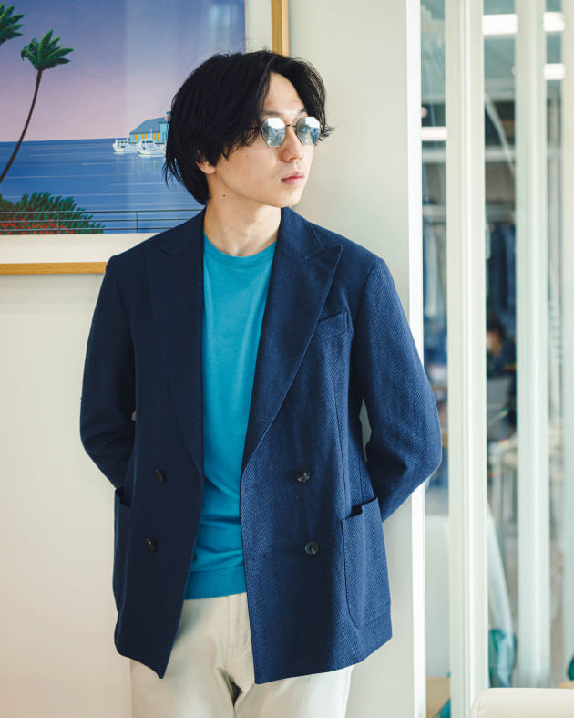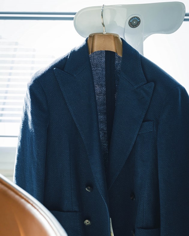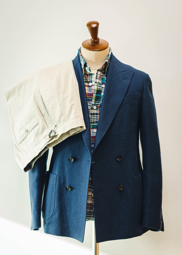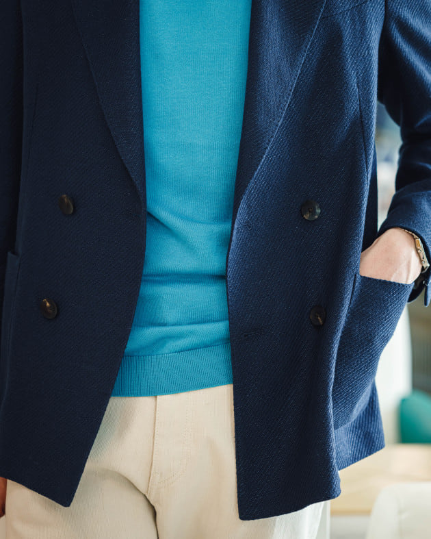 今シーズンは注目の4つボタンダブルの形を提案。クラシカルながらほんのりスポーティな空気感を持った一着です。