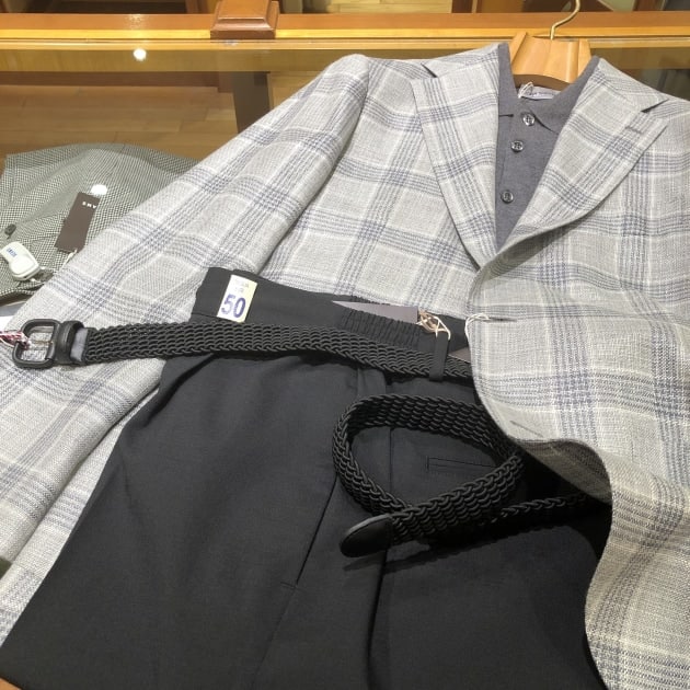 ニットポロにジャケット、紐はしまってベルトで夏のジャケパンスタイルでも。