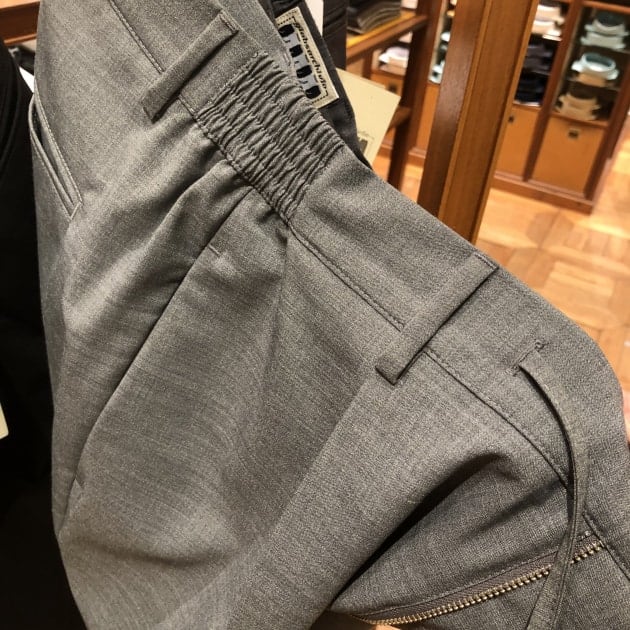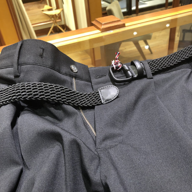 ベルトをすれば表情はベーシックなウールパンツそのもの。