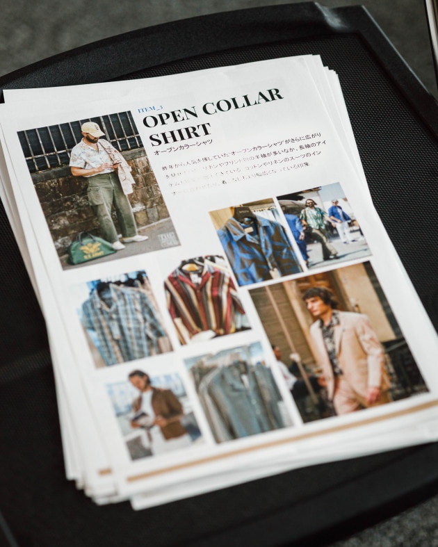 「イタリアのブランドなどでシンプルな台襟のシャツにプリントを載せているものも今までの提案では多くありましたが、23年春夏シーズンではオープンカラータイプが非常に多いのも特徴です。コットンやリネンのスーツに合わせるコーディネートなどが印象的でした。」