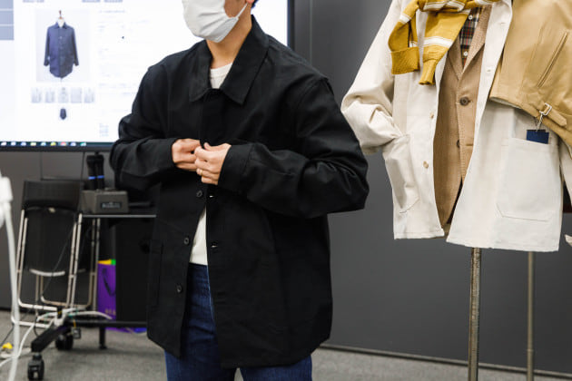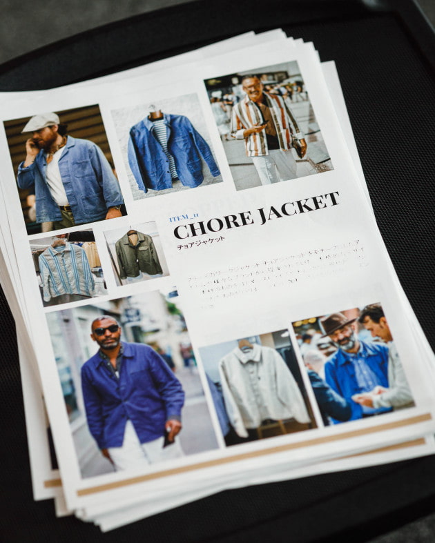 「言葉だけ聞くと新鮮なワードですが、所謂カバーオールのことです。フランスのワークスタイルからきているジャケットで、フロント3パッチポケットのタイプのものをチョアジャケットと言い、ファッション的な視点からはこちらが正しい表し方とされています。カバーオールは少しカジュアルな砕けた言い方ですね。このチョアジャケットは非常に多くのブランドから提案されており、リラックス感のあるゆったりとしたものからモダンでシャープなシルエットにアップデートされたものまで、フィッティングやその合わせ方も様々です。レイヤードスタイルを中心として提案していますが、さらっと軽く羽織る着こなしもおすすめしたいですね。」