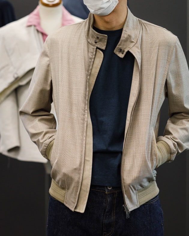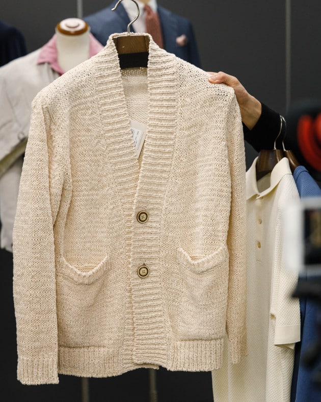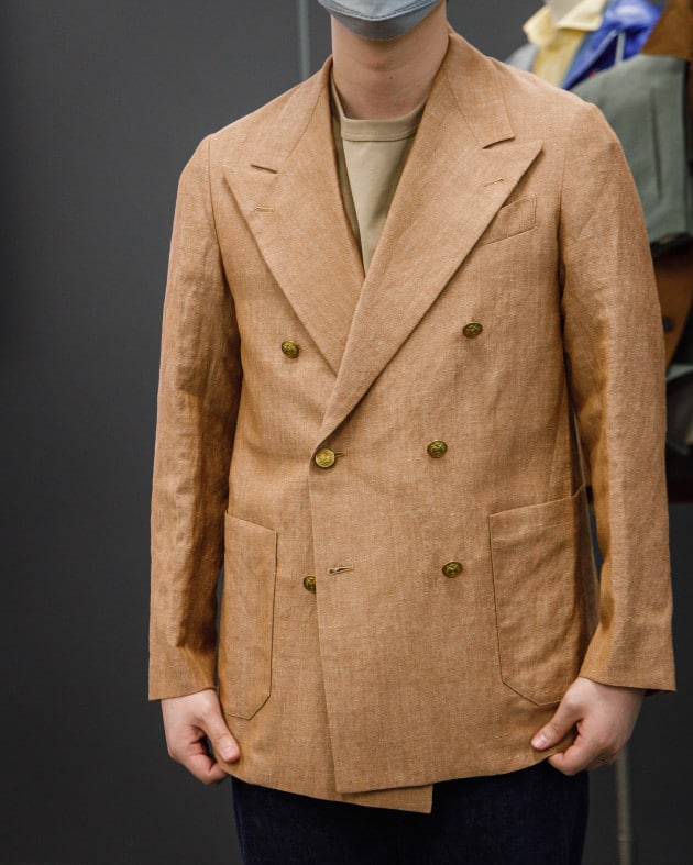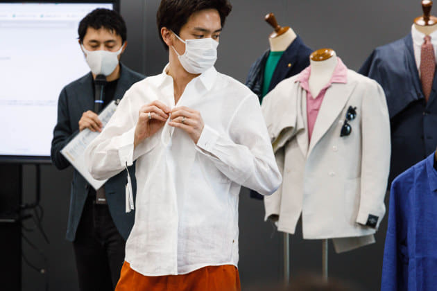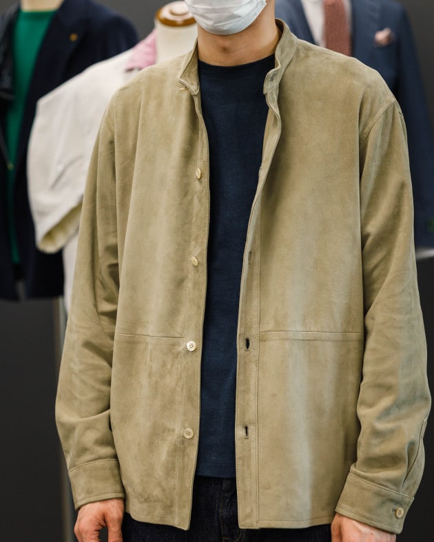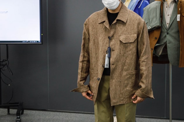 「こちらも変わらず継続して出てきています。フィッティングはゆったりとしたものがほとんどで、よりカジュアルにリラックスして着るような流れが強まっていますね。リネン素材を中心に提案されており、一枚ではもちろん、ジャケットやスーツのインナーとしてドレスダウンする着こなしも見られました。また、スエードなどのブルゾンタイプにも落とし込まれており、素材や形の幅が広がっているというところにも注目です。」