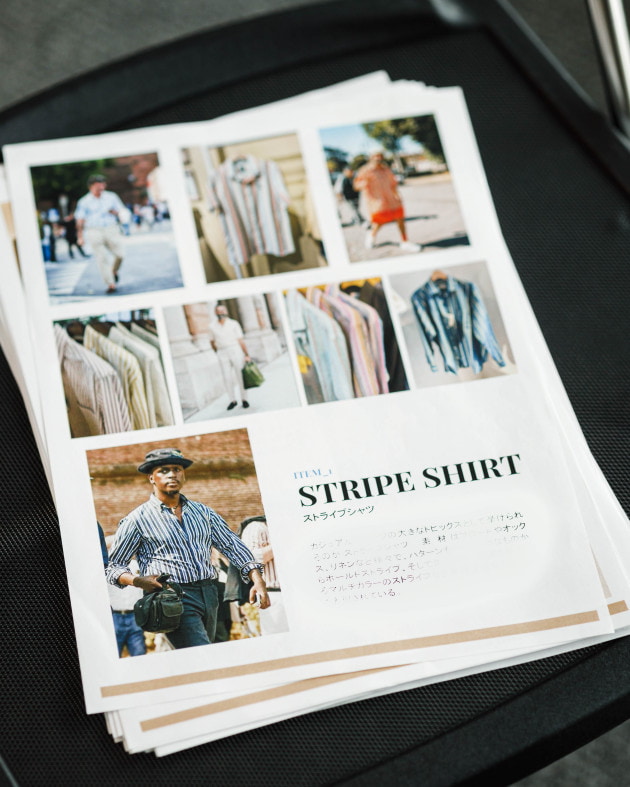 「主にカジュアルシャツに見られる傾向ですが、様々なストライプがシャツに落とし込まれています。サンドストライプ、オルタネイト、ボールド、、、中でも特に注目したいのがマルチストライプですね。このマルチストライプはこれまで何度も提案されてきており、所謂リバイバルの流れ。私が経験してきた時代で言うと80年代半ば、90年代、2000年代前半と、いくつものタイミングで注目されてきました。装いの主役となるやや主張の強いものが多く見られます。」