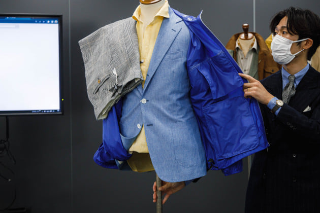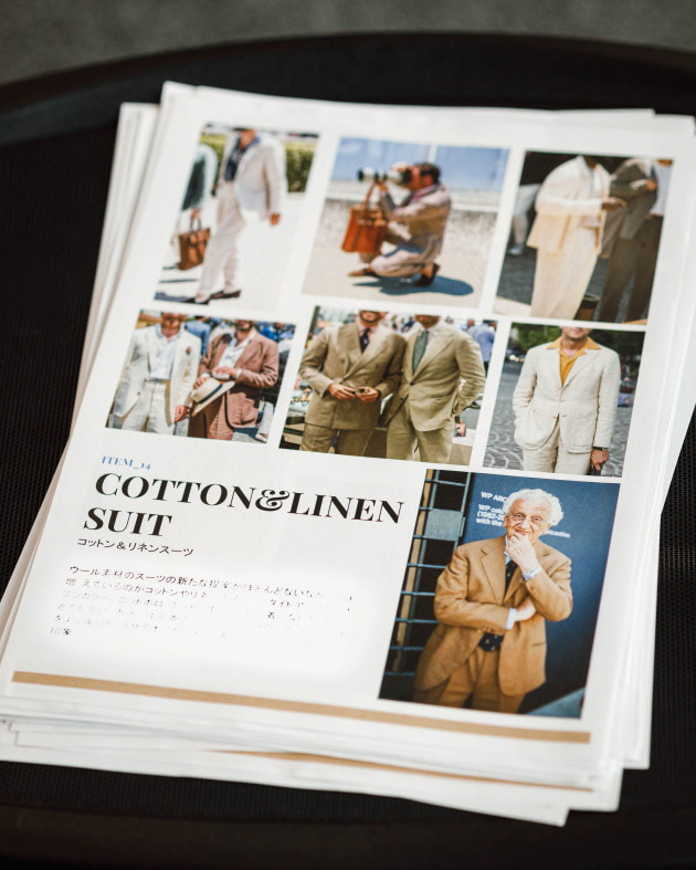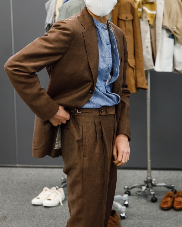 「”スーツを愉しむ”というポジティブな流れから、コットンやリネンが提案としては多い印象です。ベージュ、ブラウン、ブルー、カーキ。多種多様な素材、ディテールで表現されています。着こなしもリラックスムードが中心で、ニットやTシャツ、カジュアルシャツとさらっと合わせていくようなスタイルが増えていますね。また、テックファブリックを使ったものも多く、都会的なカジュアルセットアップという打ち出しも多く見られます。ドレッシーなスーツに関しては特に大きな流れはなく、クラシカルなパターン、素材を載せていくという傾向が強い印象です。」