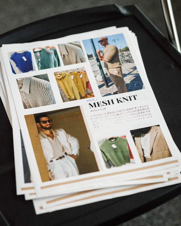 「こちらは新しい流れです。所謂オープンニットと呼ばれる、編み目が緩く少し透け感のあるニットのことを指します。過去を遡ると、ハイブランドやラグジュアリーブランドなどでは提案されていたことがありましたが、クラシックなニットブランドが提案しているのは自身の経験上初めて。ファッション性の高いかなり透けたような物ではなく、ほんのりと肌が覗くようなテイストとしての透け感というものが多く見られました。」