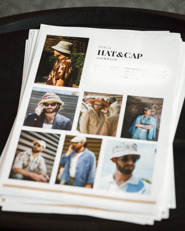 「春夏のシンプルな装いのアクセントとしての流れであるハット&キャップ。ボルサリーノのようなハットは依然として人気が高いですが、やはり注目はベースボールキャップ。数シーズン前から出てきていたキーワードで、23年春夏シーズンも多く提案されています。プレッピーテイストなものから、大人の男性が上品に被れるものまで幅が広いのも特徴的です。また〈BEAMS F〉、〈Brilla per il gusto〉ではバイイングしていませんが、バケットハットのようなものも出てきています。カジュアルからの流れですが、80〜90年代前半に実際に流行っていたものなのでリバイバル的な側面もありますね。」