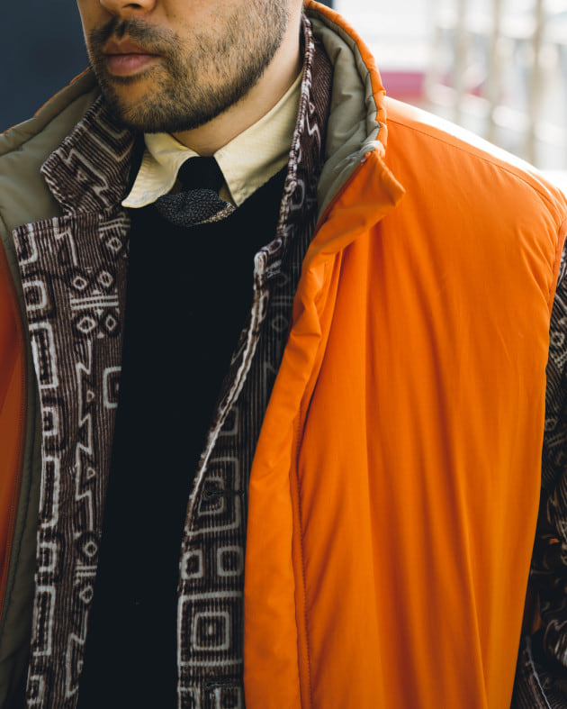 ジオメトリックのプリントが目を惹くコーデュロイ素材のジャケットは〈BEAMS PLUS〉のオリジナル。オレンジのダウンベストのレイヤードで柄を抑えつつ引き立てるような、絶妙なニュアンスをつけて。ベスト無しのバランス感ももちろん配慮して構成しています。