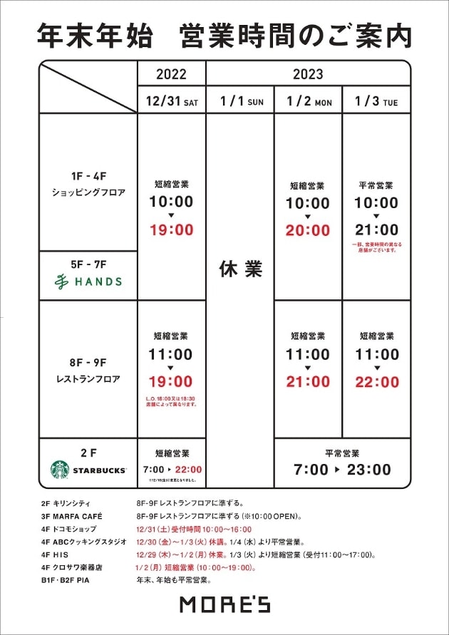 年末年始の横浜モアーズ営業時間です。