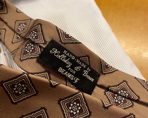 こちらのネクタイは〈Holliday & Brown〉の新作プリントタイ。ミルキーなブラウンベースにワインのスクエア柄が大人な配色です。