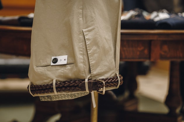 こちらも王道のベージュのコットンパンツにメッシュベルトのコンビネーション。この辺りは外しませんね。