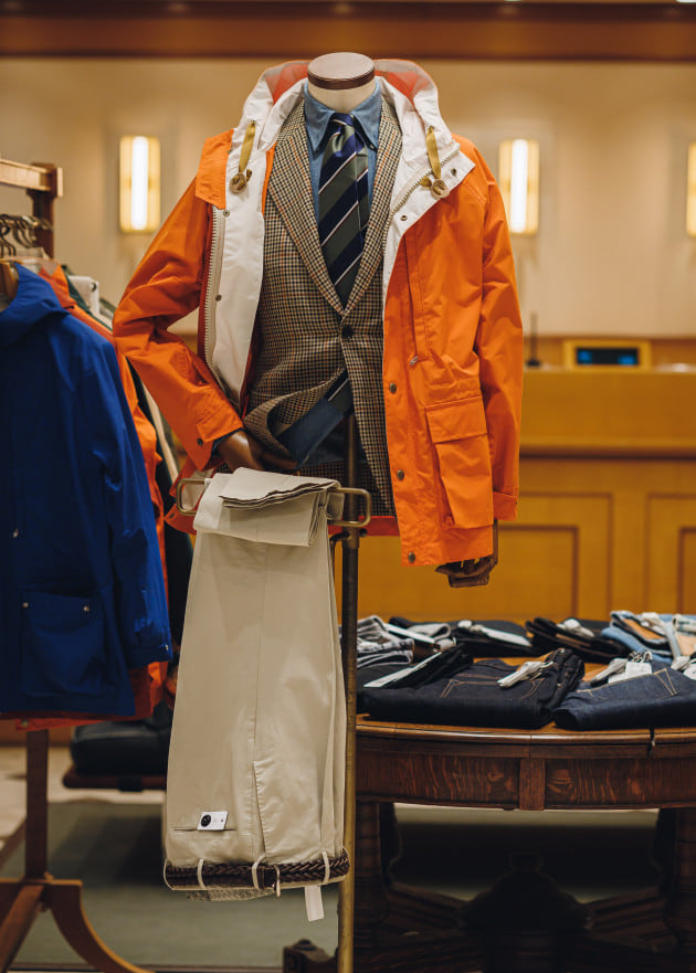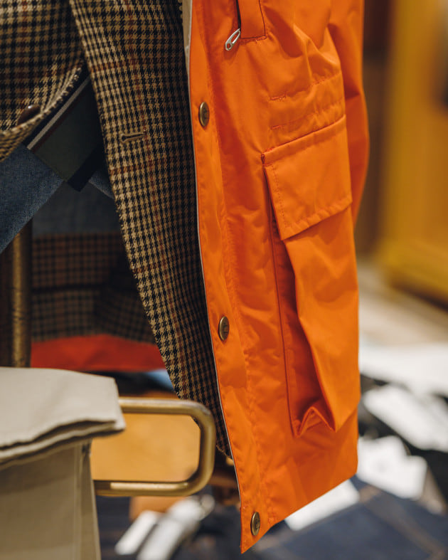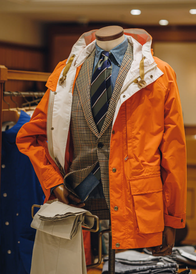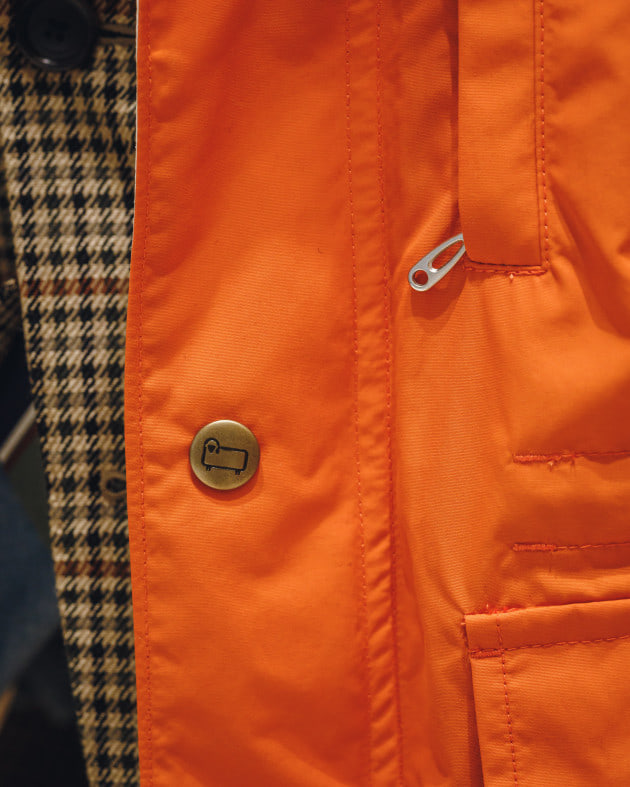 〈WOOLRICH〉のマウンテンパーカ。70年代のアーカイブをベースにそのクラシックな空気感を活かしつつ、今の気分で着られるよう作り込まれた一着です。鮮やかなオレンジにアウトドア由来のアクティブなルックスがジャケットスタイルのほどよいスパイスに。丈感も絶妙なバランス。