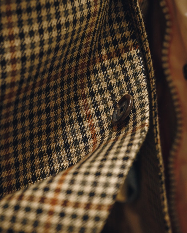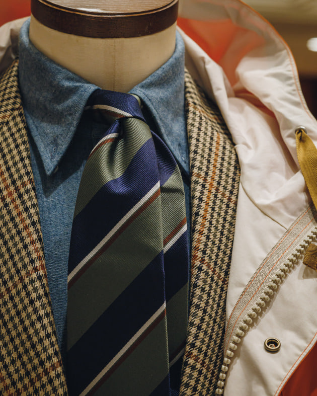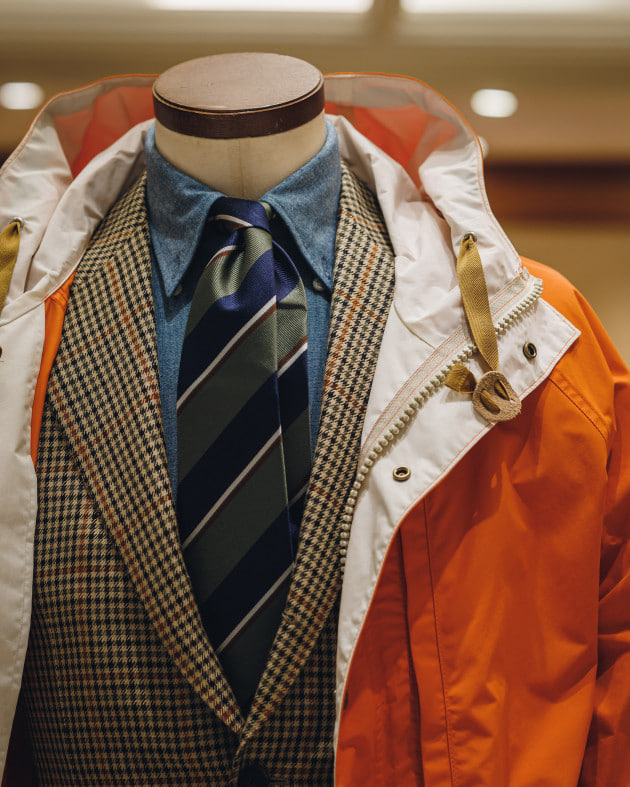 今回はガンクラブチェックのジャケットをベースとしたブリティッシュカントリーなムードのスタイル。シャンブレーシャツにレジメンタルタイの王道Vゾーンに多色遣いのガンクラブチェック。粗野で男っぽい主張と鮮やかなオレンジとの対比がこなれています。パーカの白を挟むことでよりナチュラルなレイヤードで見せられます。