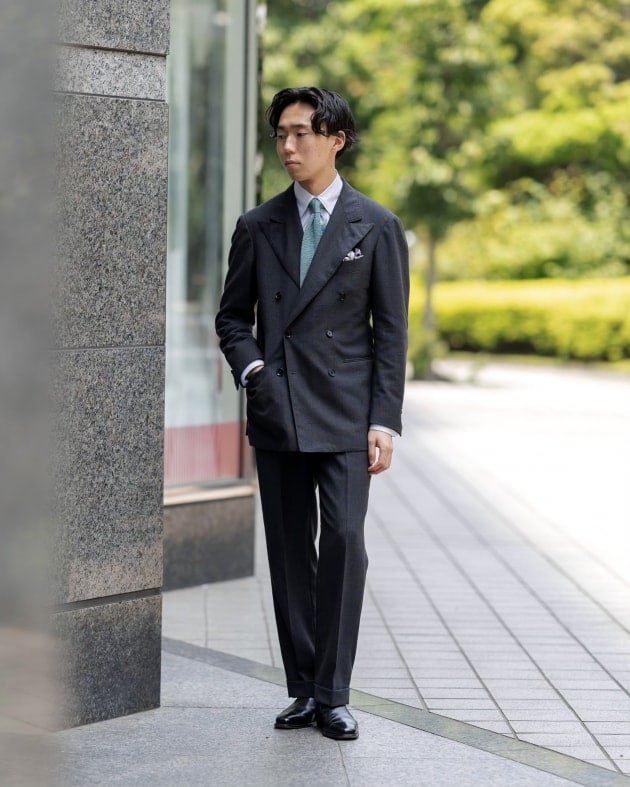 シャツに十分捻りがある為、シンプルに合わせるのが間違いない無さそうです。綺麗な水色のニットタイ、パープル系のグラデーションチーフで淡いシックなVゾーンに仕上げました。